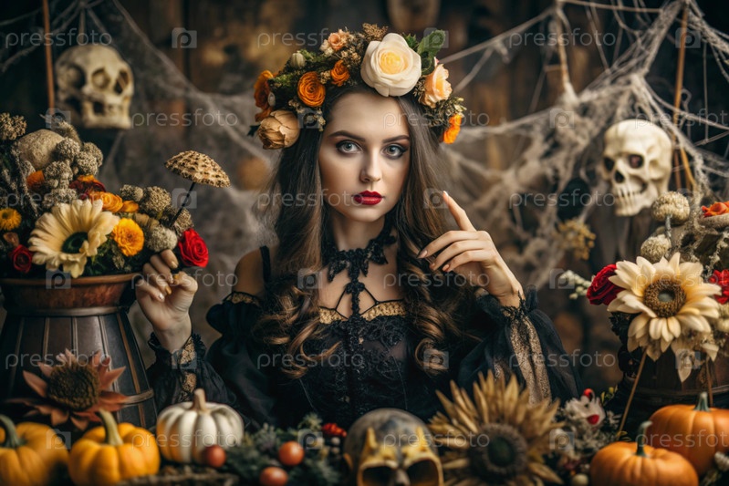 Концепция Хэллоуина. Ужасное. Костюмированная вечеринка. Красивая женщина в костюме ведьмы. Баннер, открытка