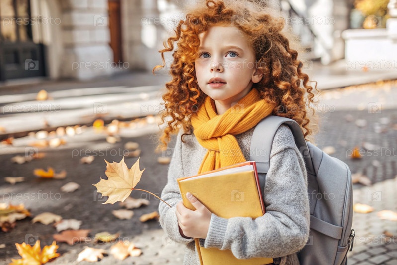 Красивая рыжеволосая девушка с очками и букетом осенних цветов впервые идет в школу. Ребенок со школьной сумкой, книгой и цветами. Малыш на городской улице