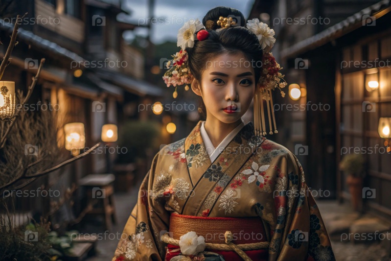 Японская девушка в традиционном национальном костюме - кимоно. На фоне домов, фонарей и вишневых деревьев портрет символизирует традиции и культуру народа Японии