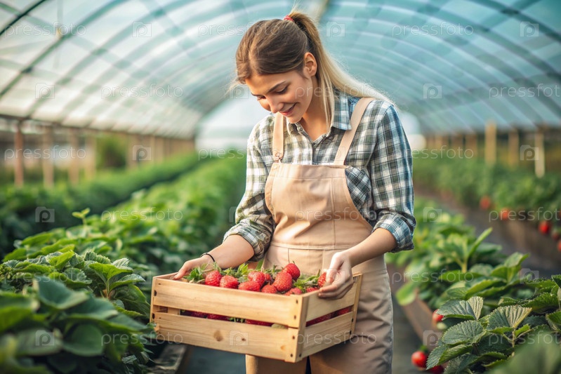 Сельскохозяйственная промышленность. деревянный ящик со клубниками в руках фермерской девушки. садовник собирает богатый урожай в теплице