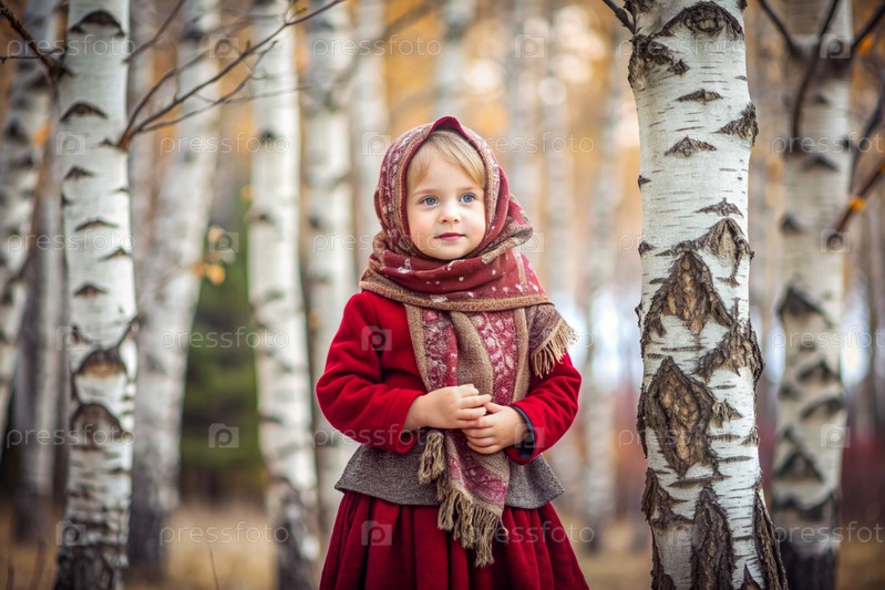 Русские народные традиции.Русский аромат.Красивая девочка в национальном русском платье и шарфе в красивом березовом роще.Портрет прекрасной девушки в березном лесу