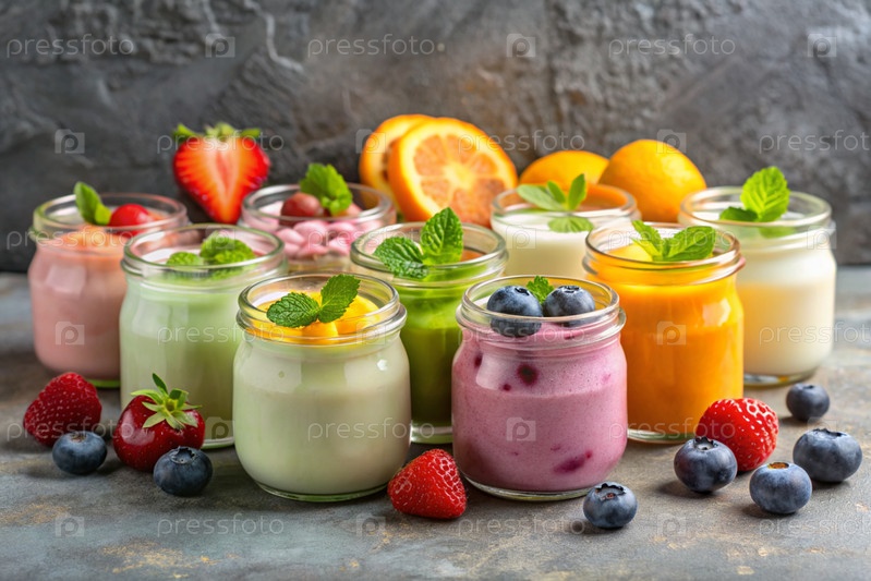 Разнообразный домашний йогурт с различными свежими ягодами и фруктами в стеклянных банках на стильном сером фоне