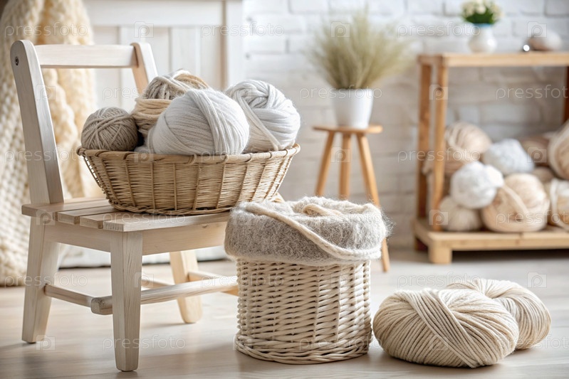 шарики пряжи в корзине из плесеня в белых и бежевых тонах швейная работа, текстиль, вязание зимний сезон, малый бизнес, ручная одежда