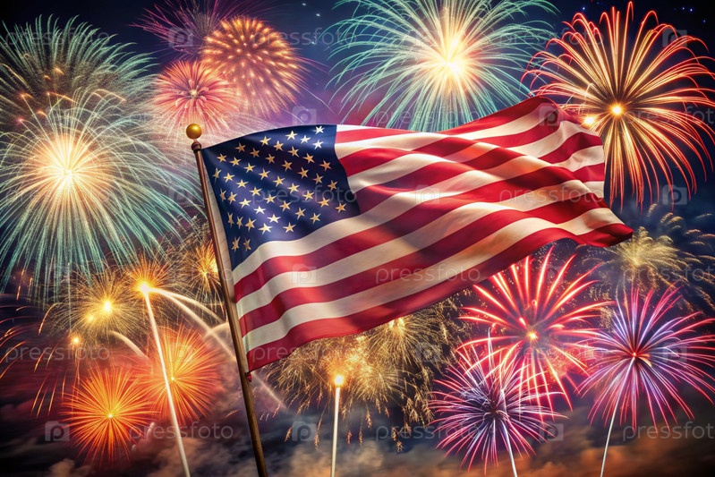 Флаг США с фейерверком в небе День независимости - 4 июля под открытым небом