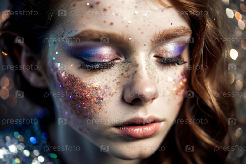 Покрытие лица девушки праздничным макияжем и ленточками.Изображение придает ей сказочный и мистический вид.Концепция новогодней ночи или дня рождения
