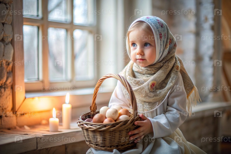 Счастливая Пасха. Христианство. Портрет трехлетней девочки в русском народном платье и шалах с корзиной из плети с пасхальными яйцами в руках на фоне православной церкви