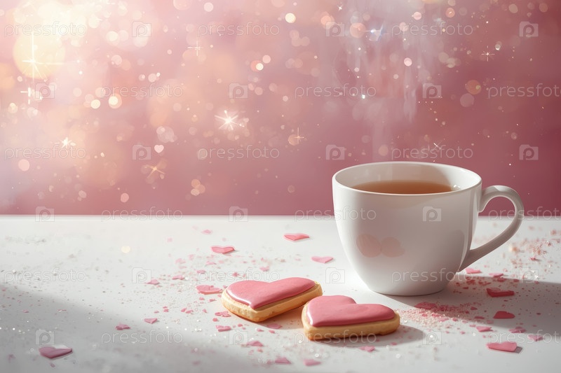 Домашнее имбирное печенье в форме сердца и чашка чая на столе. вкусный имбирный кекс в форме сердца на светло-розовом фоне. свежевыпеченный имбирный кекс на День святого Валентина