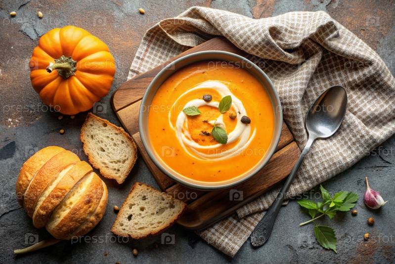 Традиционный мягкий тыквенный суп с сливками и семьями тыквы на коричнево-бежевом фоне