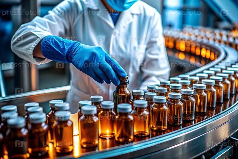 Производство лекарств: фармацевт тестирует медицинские флаконы на автоматическом трубопроводе фармацевтической производственной линии с использованием искусственного интеллекта