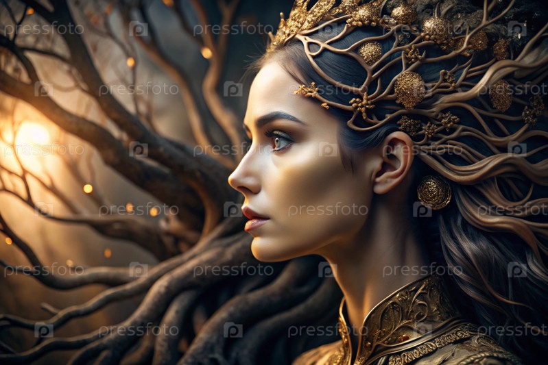 Творческий баннер для салона красоты в черно-золотом цвете. Красивая женщина, окруженная лесом с макияжем и волосами. Золотые ветви дерева в волосах. Индустрия красоты