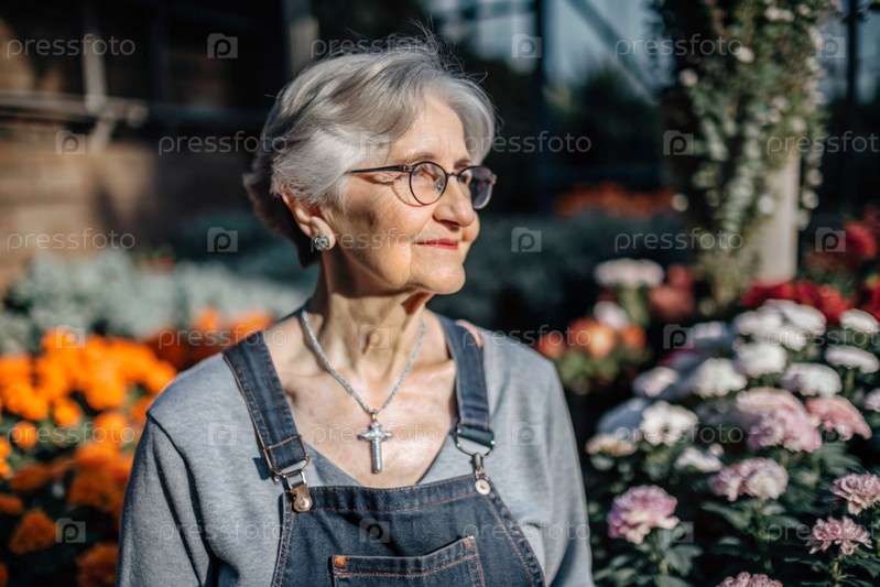 Пожилой садовник с седыми волосами в комбинезоне в уютной цветочной теплице