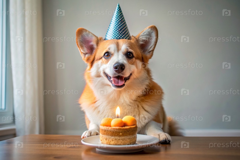 Собака сидит с тортом, воздушными шарами и флагами на вечеринке по случаю дня рождения