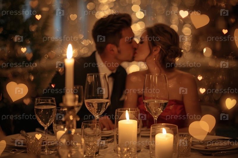 Концепция Дня святого Валентина: элегантная пара, целующаяся на романтическом ужине при свечах с бокалами вина в роскошный вечер