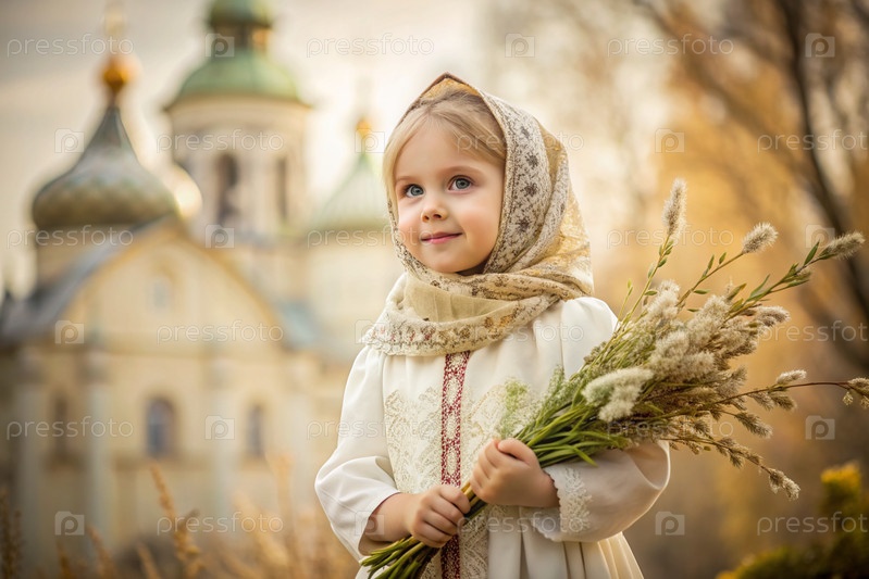 Портрет трехлетней девочки в русском народном шале с букетом дикой травы в руках на фоне православной церкви