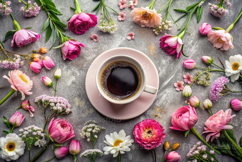 Красивая открытка. чашка кофе с тарелкой и весенними цветами. красивый натюрморт. весна, лето. доброе утро концепция