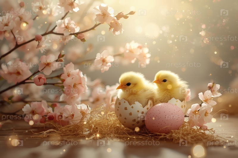 Концепция яркого Пасхального праздника. Нежные розовые пасхальные яйца, желтые курицы и вишневые ветви на деревянном фоне. Концепция ярких пасхальных праздников в 2026 году