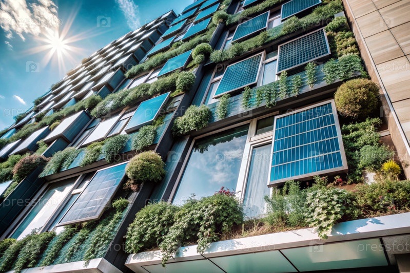 Новый жилой район с современными семейными новостройками, многоэтажное здание со солнечными батареями для электроснабжения и отопления фасадов