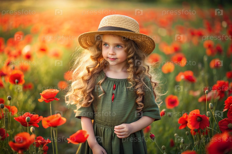 Портрет красивой кудрявой девушки в соломенной шляпе и платье на цветущем поле красного мака. Детство. Девочка позирует и смотрит в камеру