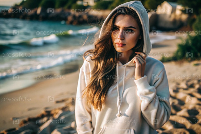 Красивая молодая женщина в белой свитерке на пляже. макеты шаблонов для дизайна гофри, печатные площади для логотипа или дизайна