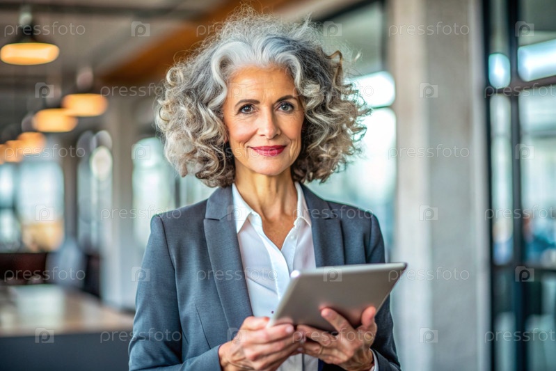 Деловая пожилая женщина с кудрявыми волосами. Она носит простую куртку. В руках таблетки. Бизнесмен смотрит на экран своего смартфона