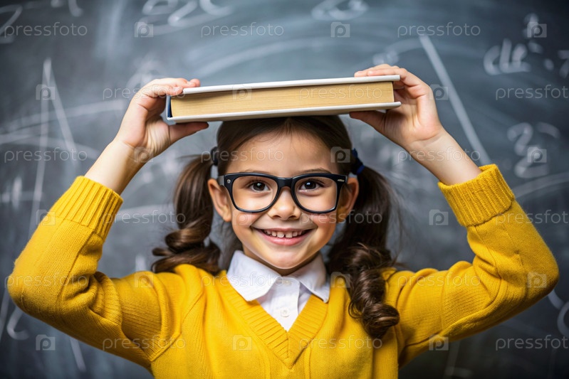 Красивая девушка с очками и книгами на голове. Ребенок впервые идет в школу. Ребёнок в классе со доской на заднем плане. Возвращение к школе