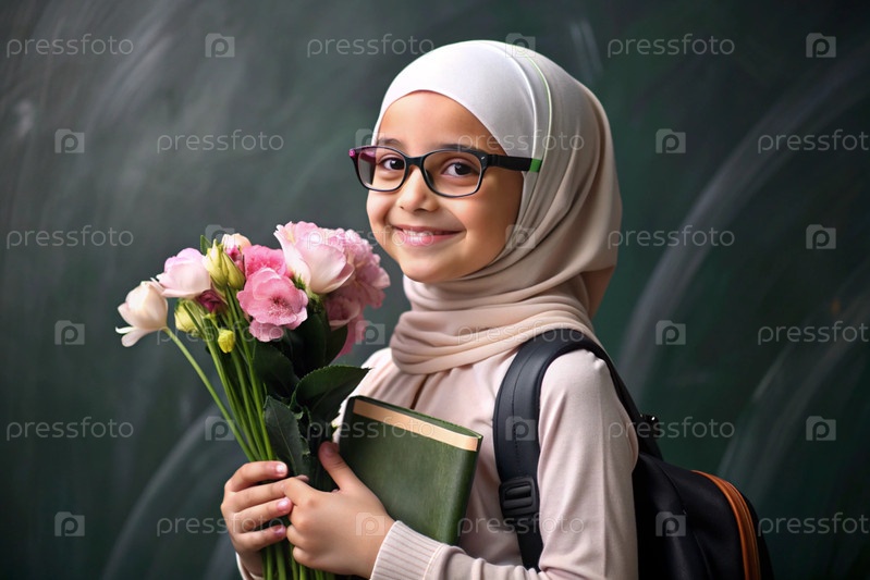 Первоклассник-мусульманин с очками на доске. Девушка держит цветы в руках. Ребенок пойдет в школу впервые. Ребёнок с рюкзаком, книгой и цветами. Возвращение к школе