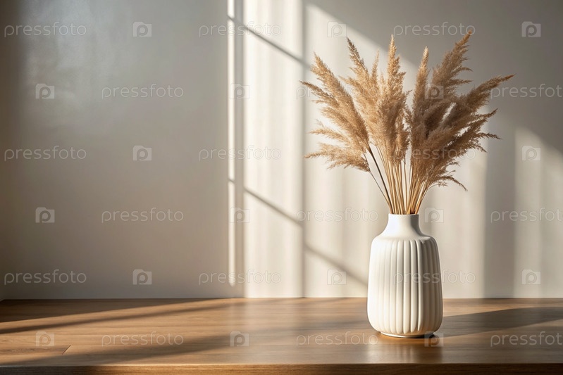 Современная белая керамическая ваза с сухой травой на деревянном столе Скандинавский интерьер Пустая белая стена со тенью из окна