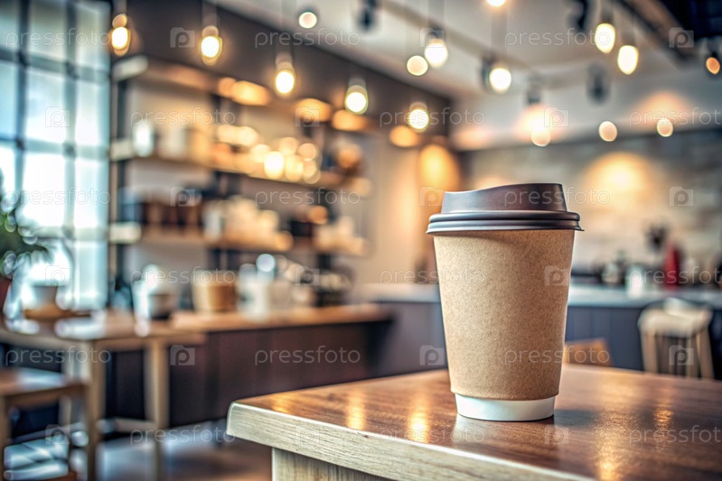 Экологически чистый бумажный стакан для одноразового использования с кофе на столе против размытого фона кофейни