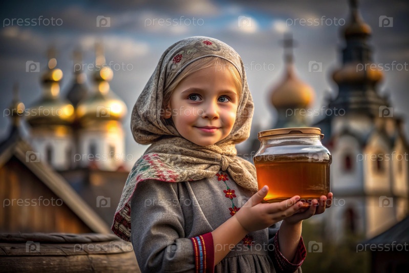 Концепция российского православного праздника 'Мед Спаситель' - красивая маленькая девочка в русской национальной одежде и шарф с баночкой меда на фоне православной церкви