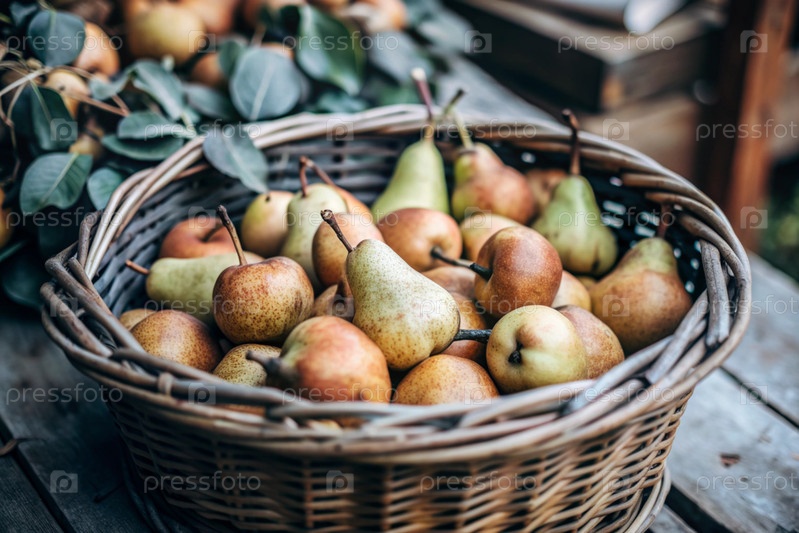 Груша, собранная с ветви дерева в корзину из уксуса, крупный план. Красивое солнечное сияние. осенний урожай