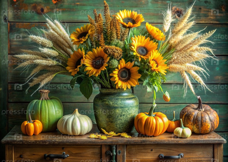 Красивый осенний букет желтых подсолнечников и пшеницы в вазе и декоративные тыквы на древнем деревянном шкафу. Букет цветов в вазе во внутренней части дома. Желтый, зеленый цветочный фон