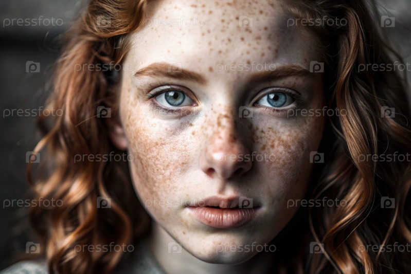 Глубокий эмоциональный портрет.Лицо молодой девушки без макияжа, с выразительными глазами, кудрявыми красными волосами и веснушками на лице. Естественная женская красота