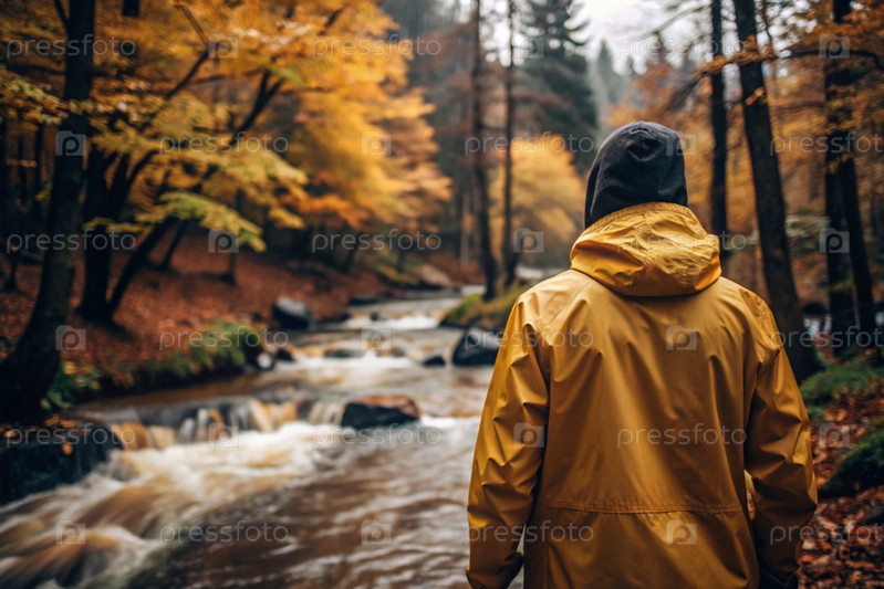 Человек в желтом резиновом плаще против огромной реки в горном лесу. он путешествует и наслаждается жизнью и окружающей средой. туризм
