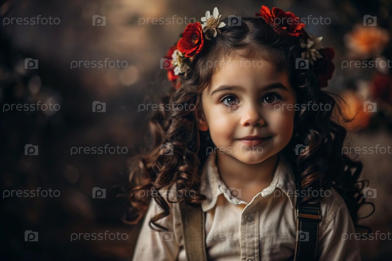 Портрет красивой маленькой кудрявой темнокожей девушки с цветочной тиарой или венком красных цветов на голове