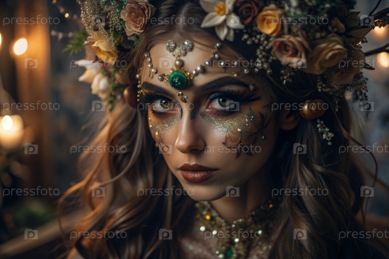 Портрет женщины с красивым макияжем, блестящими элементами, рисунками на лице и цветами в волосах