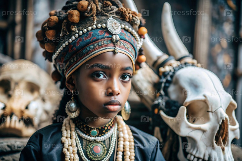 Красивая африканская девушка в традиционном национальном костюме. с костями. портрет символизирует традиции, культуру и красоту африканского народа