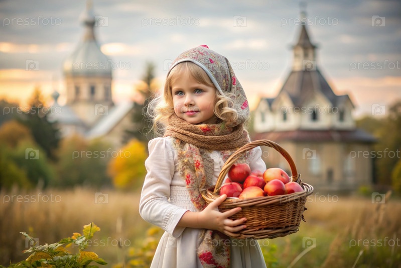 Концепция русского православного праздника Apple resort. Красивая девочка в российской национальной одежде и шарф с корзиной спелых красных яблок на фоне Православной церкви