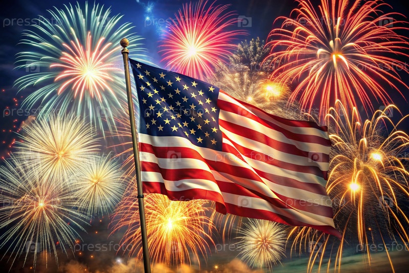 Флаг США с фейерверком в небе День независимости - 4 июля под открытым небом