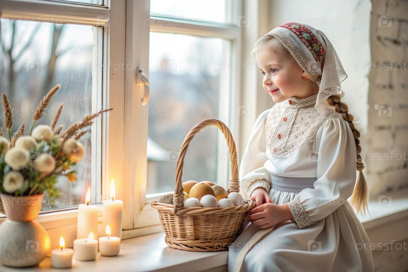 Счастливая Пасха. Христианство. Портрет трехлетней девочки в русском народном платье и шалах с корзиной из плети с пасхальными яйцами в руках на фоне православной церкви