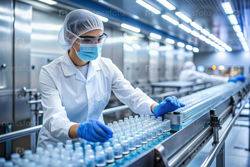 Производство лекарств: фармацевт тестирует медицинские флаконы на автоматическом трубопроводе фармацевтической производственной линии с использованием искусственного интеллекта