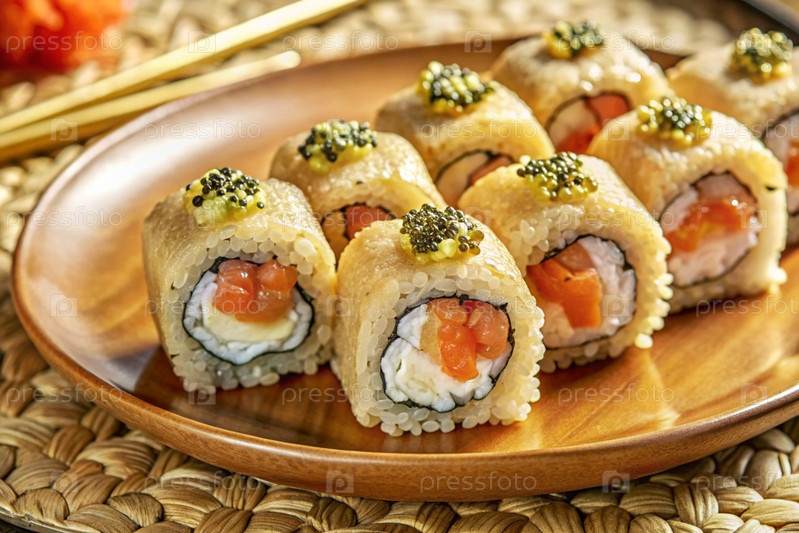 Японская еда. Суши-роллы Калифорния, Филадельфия с угорьем, красной икры и лососем. Концепция меню суши-бара