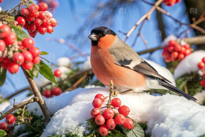 Милая красочная евразийская бульфинга, сидящая на ветке и питающаяся ягодами красного пепла