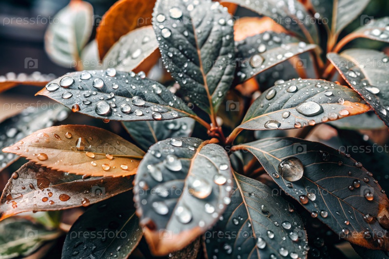 Макрографический крупный план красно-зеленых листьев, капли воды на листьях