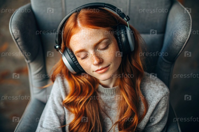 Молодая красивая рыжеволосая женщина с веснушками слушает музыку в больших беспроводных наушниках дома на стуле в гостиной