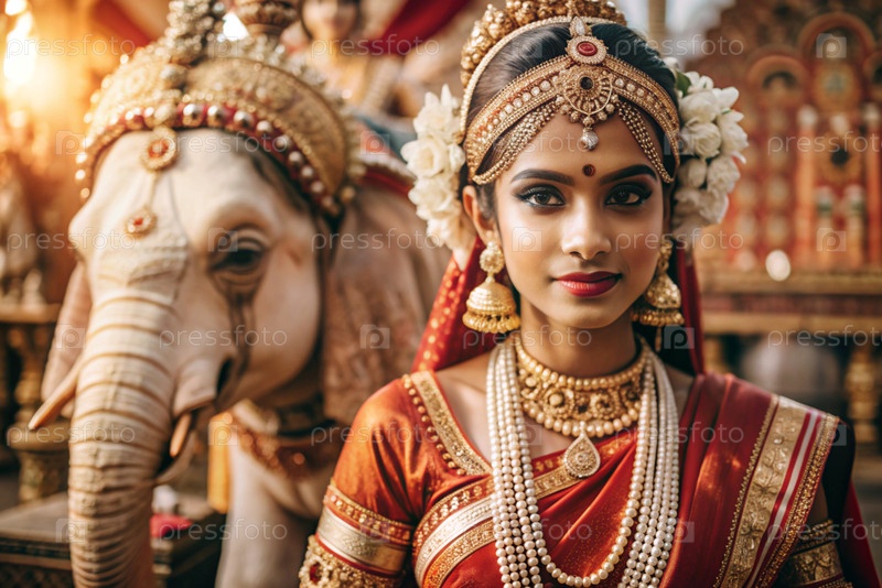 Красивая индийская девушка в традиционном национальном костюме, сари. со слонами. портрет символизирует традиции, культуру и красоту народа Индии