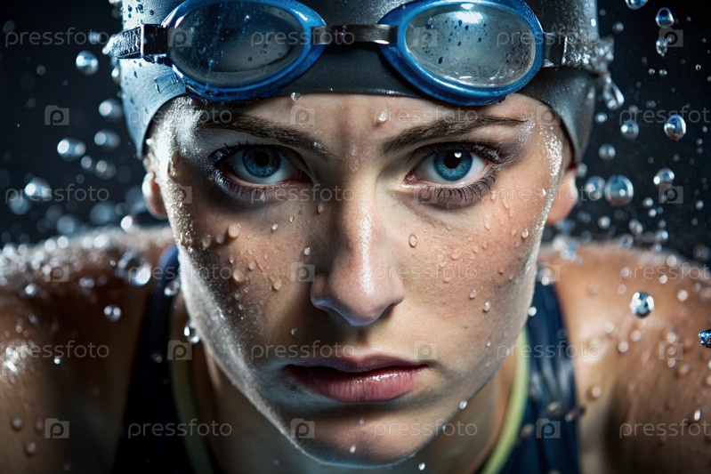 Спортивное плавание. Женское плавание. Спортсменка, которая носит очки для плавания в бассейне во время соревнований на близком расстоянии. Женщина смотрит прямо в камеру