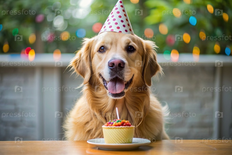 Собака сидит с тортом, воздушными шарами и флагами на вечеринке по случаю дня рождения