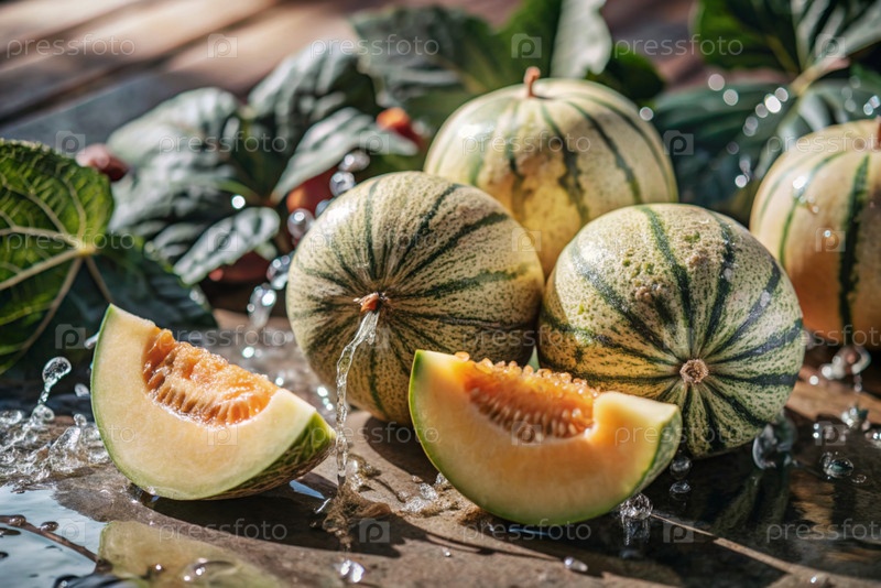 Свежие дыни.Вкусные ягоды и фрукты ярко-желтого цвета с каплями воды.Вегетарианство.Здоровое питание.Свежий плод на столе