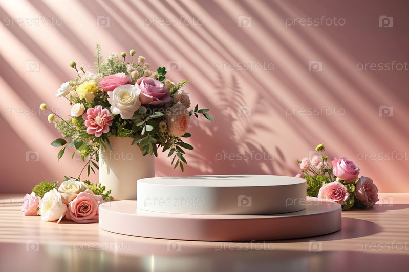 Минималистский розовый пастельный фон для демонстрации продукта.Современная подиум с розовой стеной и цветами вокруг.Креативный дизайн презентации продукции