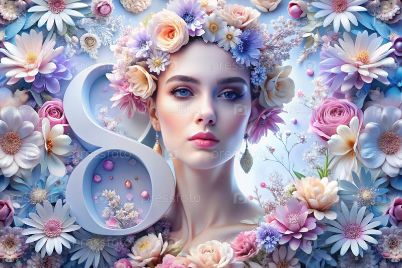 Международный женский день. баннер, флаер. весенний портрет красивой женщины в нежных синих и розовых цветах с номером 8